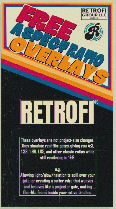 These aren’t project-size changes. They’re real film-style gates built to simulate how light, glow, and halation behave inside a projector or film camera. When applied inside a 16:9 timeline, they let light subtly spill over the frame edges and create that soft, organic gate flicker that feels analog.